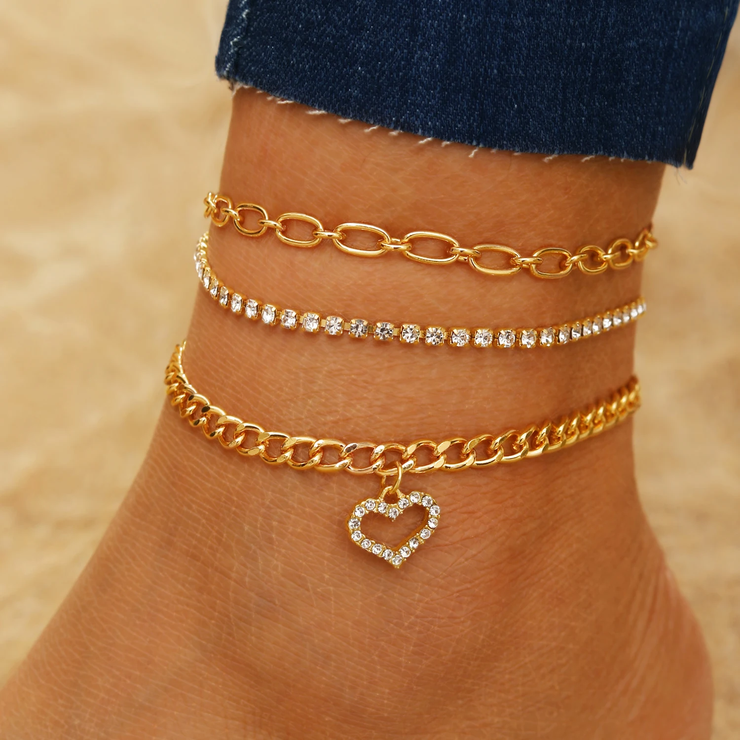 VKME New Design Tennis Chain Heart Cuban Chain Anklet For Women Jewelry